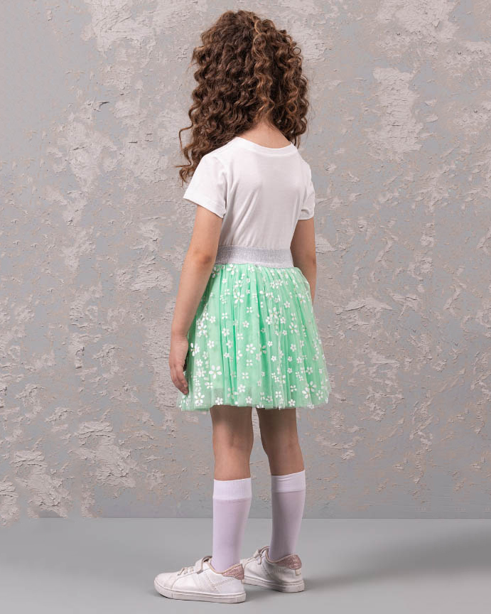 Нарядный костюм DMB для девочек оптом является уникальным предложением на рынке детской моды. Он произведен в Турции, известной своим качеством и безупречным стилем. На груди футболки расположен принт, который придает еще больше индивидуальности этому наряду. Юбка этого костюма также привлекает внимание. Она имеет широкую блестящую резинку, которая обеспечивает идеальную посадку на талии. Юбка сама по себе пышная и держит форму благодаря дополнительной юбке из сетки и хлопковому подъюбнику. Такое решение не только придает объем юбке, но и создает особый эффект при движении.