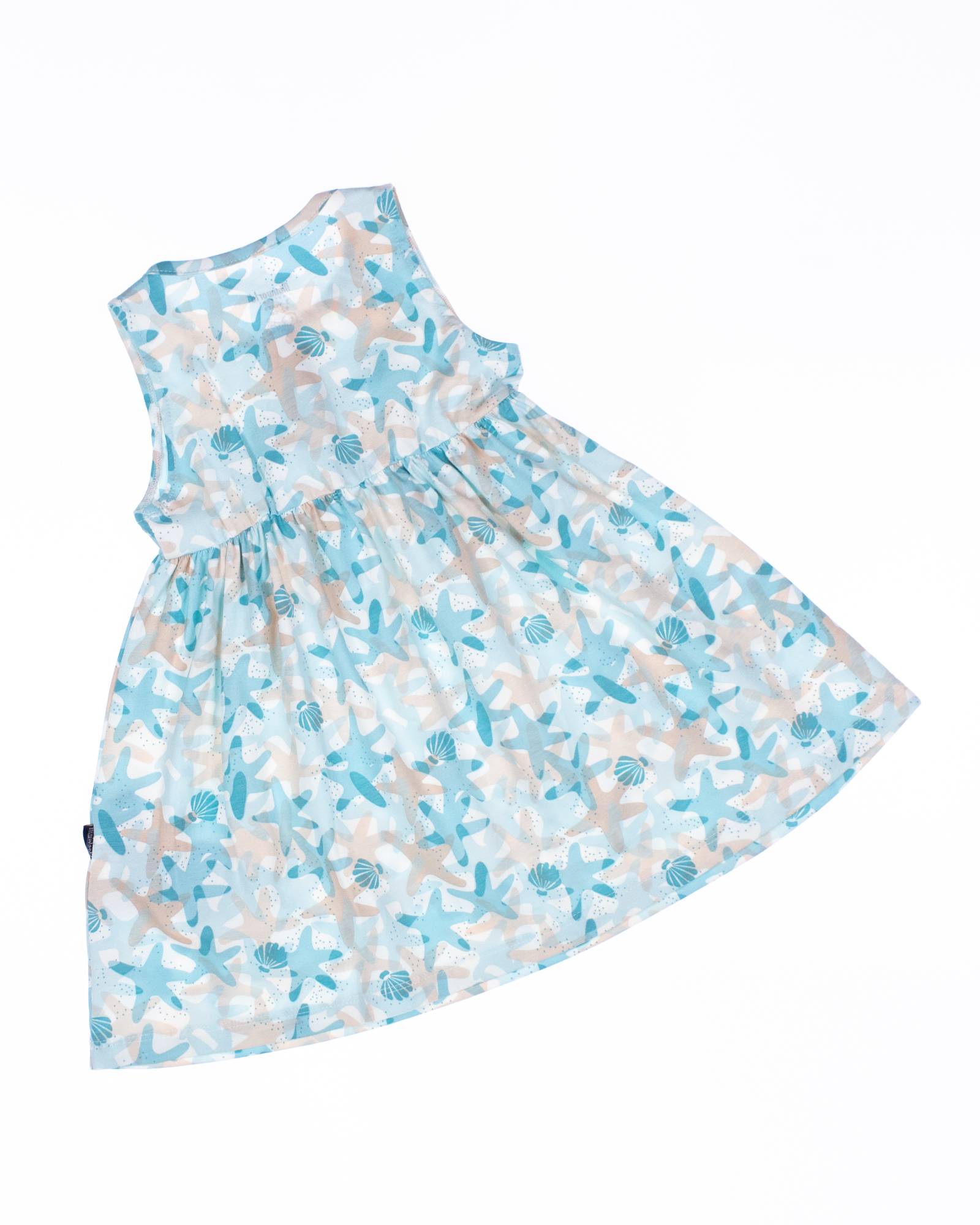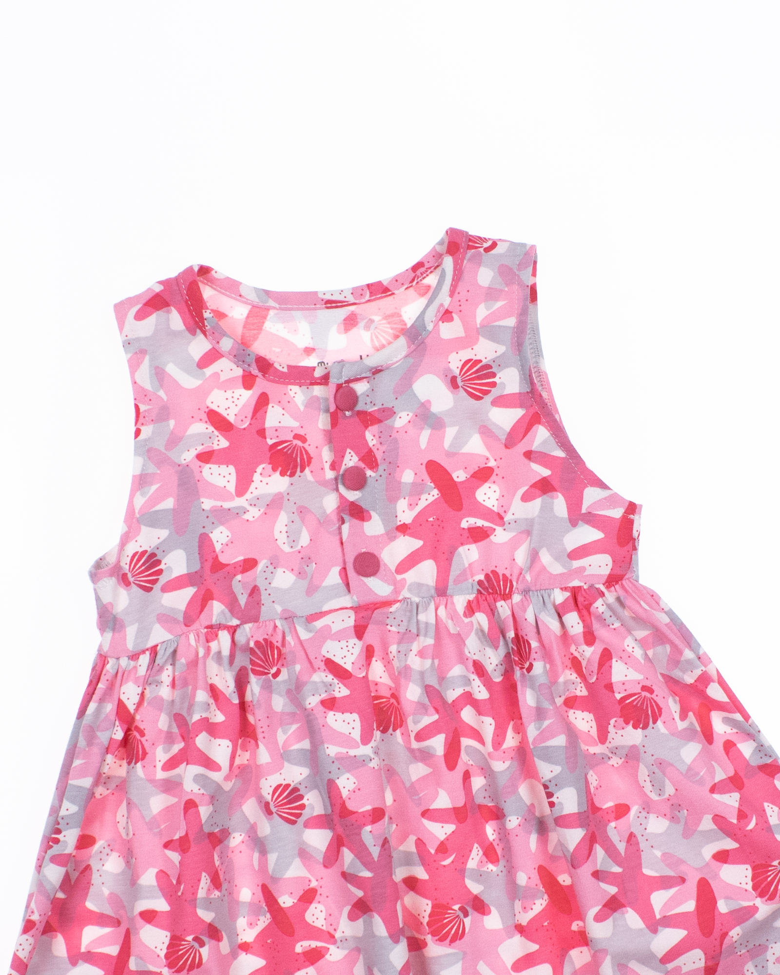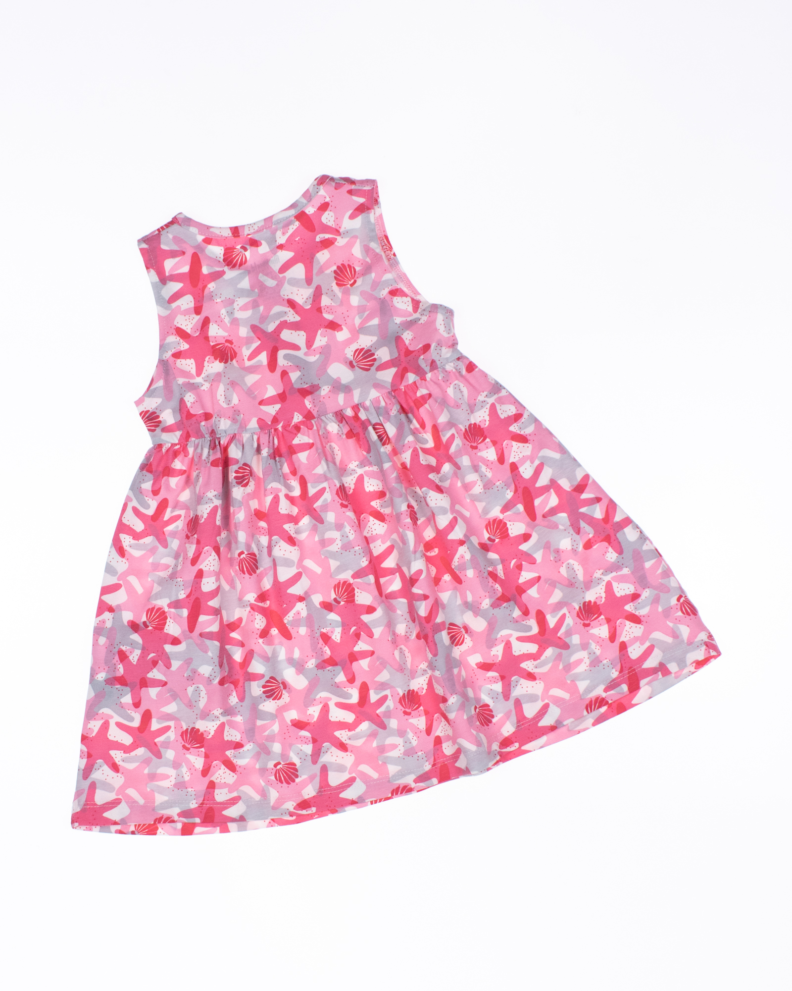 Летнее платье для девочки выполнено из эластичного хлопкового трикотажа. Платье с короткими рукавами, расклешенное снизу, с принтом. Длина изделия выше колена.