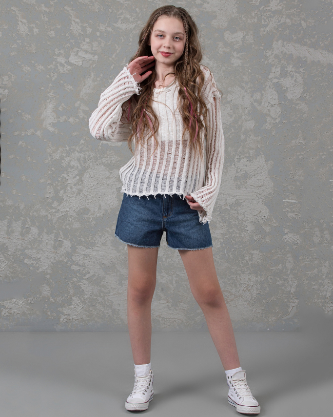 Джемпер DMB для девочек ажурной вязки оптом, выполнен из хлопка. Свободный крой, круглый вырез горловины. Модель отлично сочетается с любой одеждой. Под низ можно надеть удлиненный или короткий топ в тон джемперу.