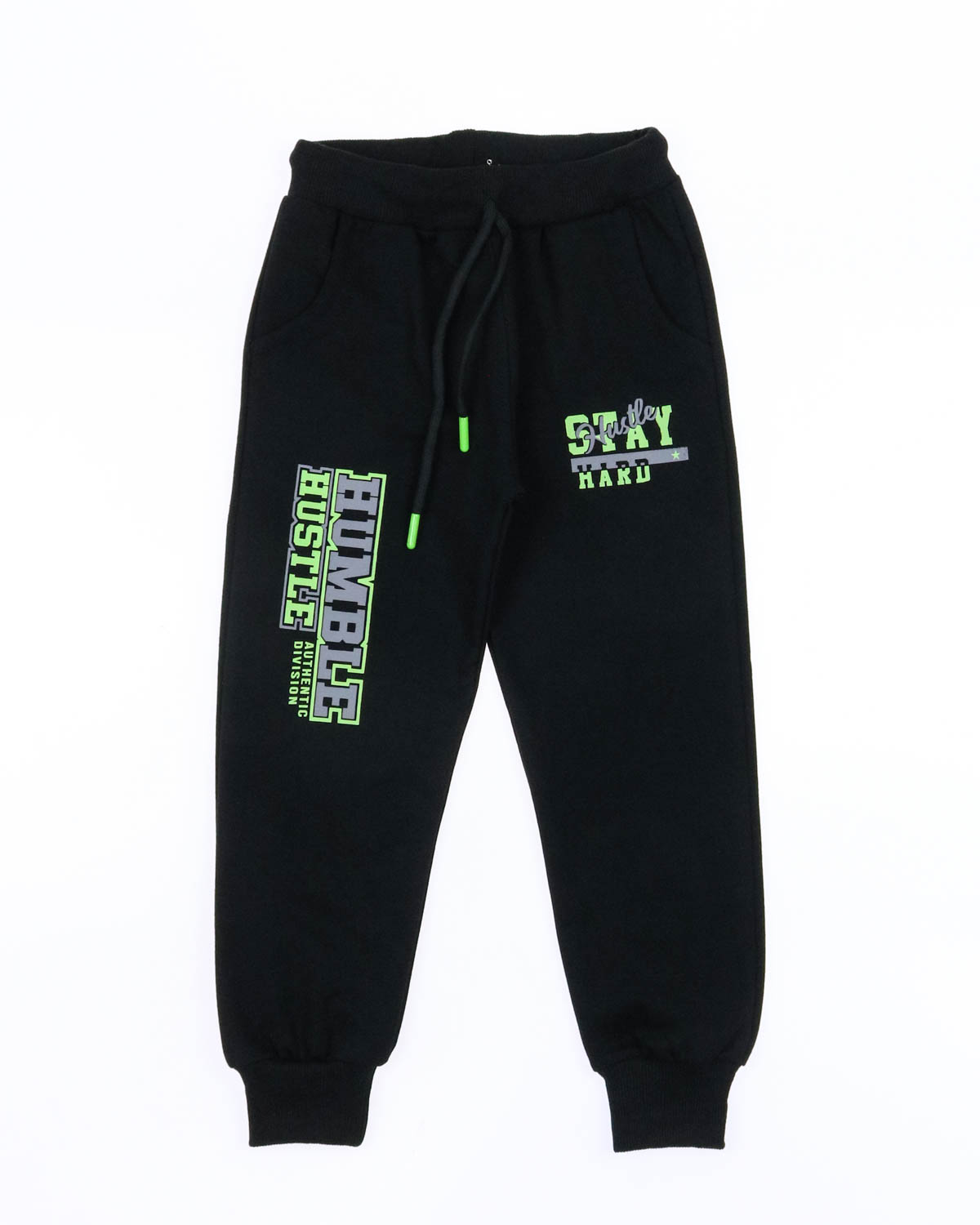 Однотонные брюки из трикотажа для мальчика, прямого силуэта, на притачном поясе с эластичной тесьмой и регулируемым шнуром спереди. Два боковых кармана, по низу брюк цельнокроеные манжеты.