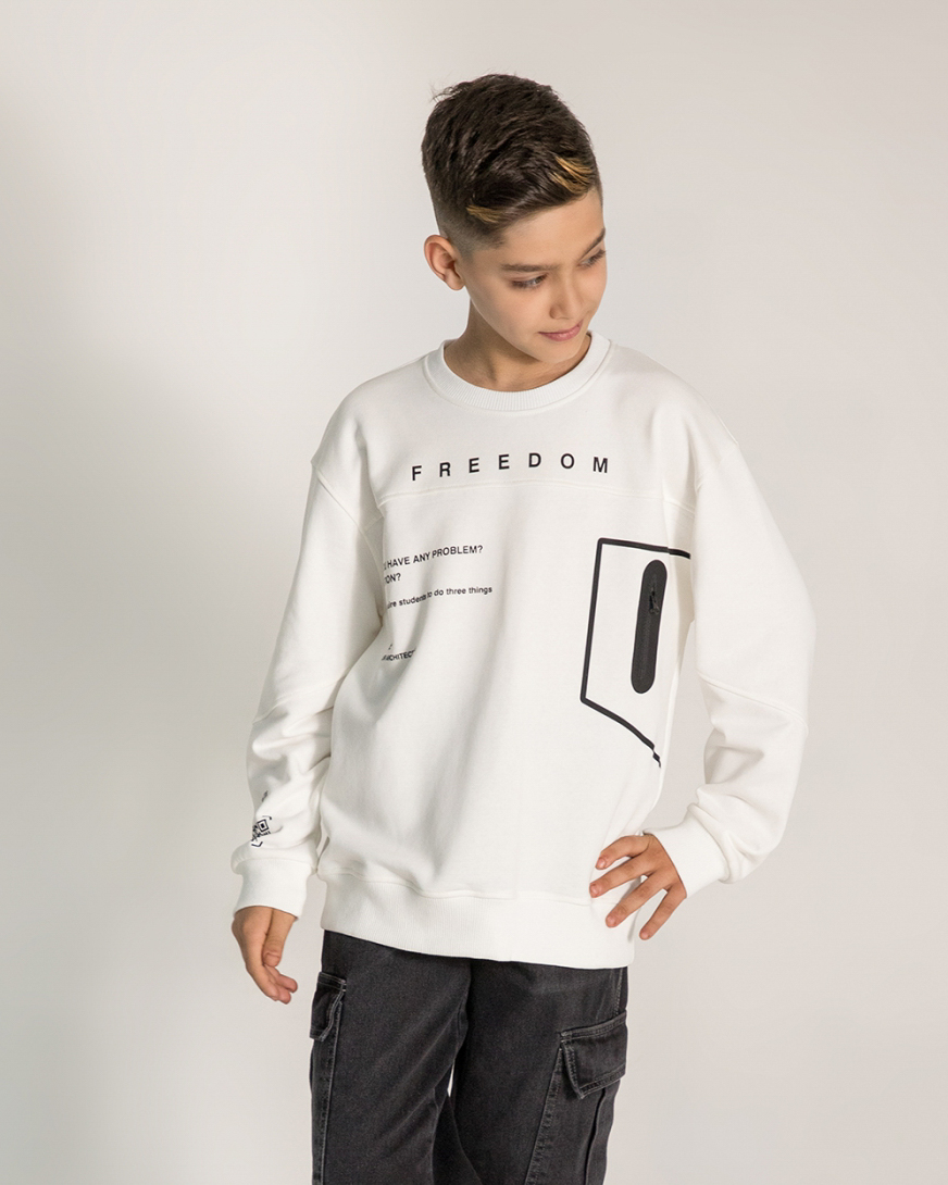 Модный свитшот выполнен из мягкого трикотажа футер (петля). Округлая горловина  и стильный принт. Дизайнеры рекомендуют носить свитшоты с  брюками или джинсами. Дополнить образ можно рубашкой, воротник и полы которой будут выглядывать из-под кофты.