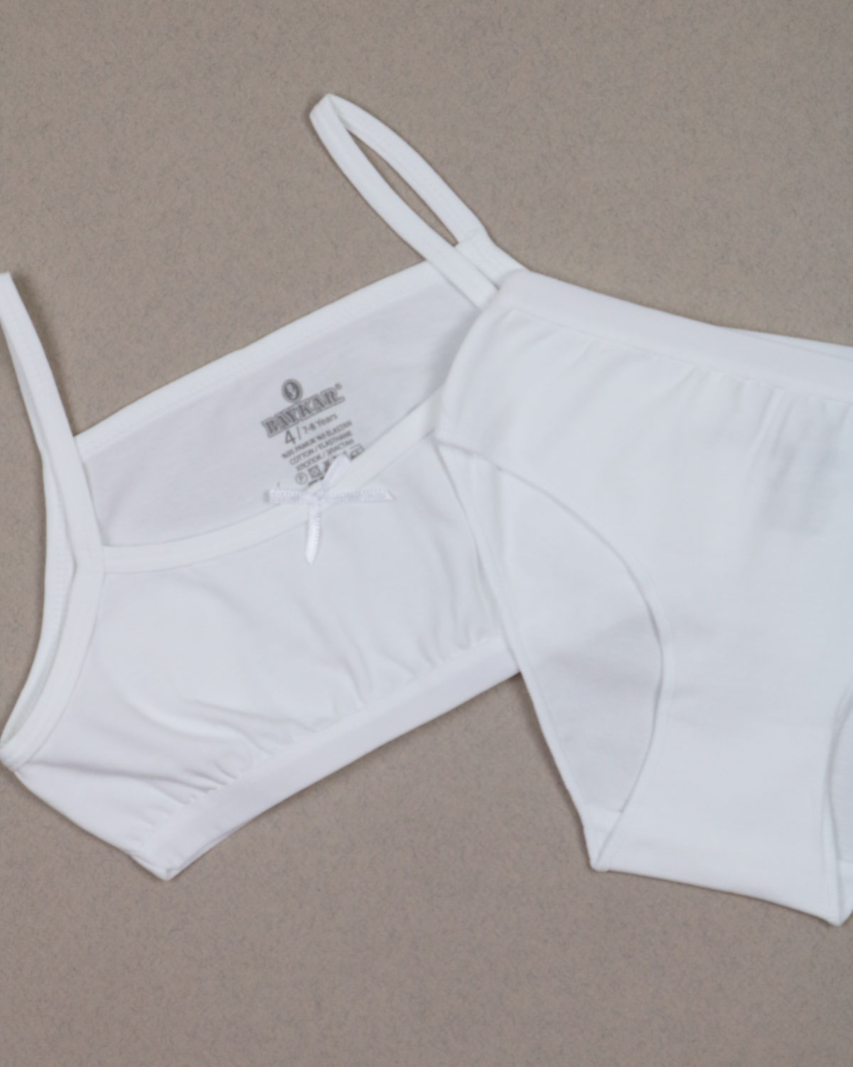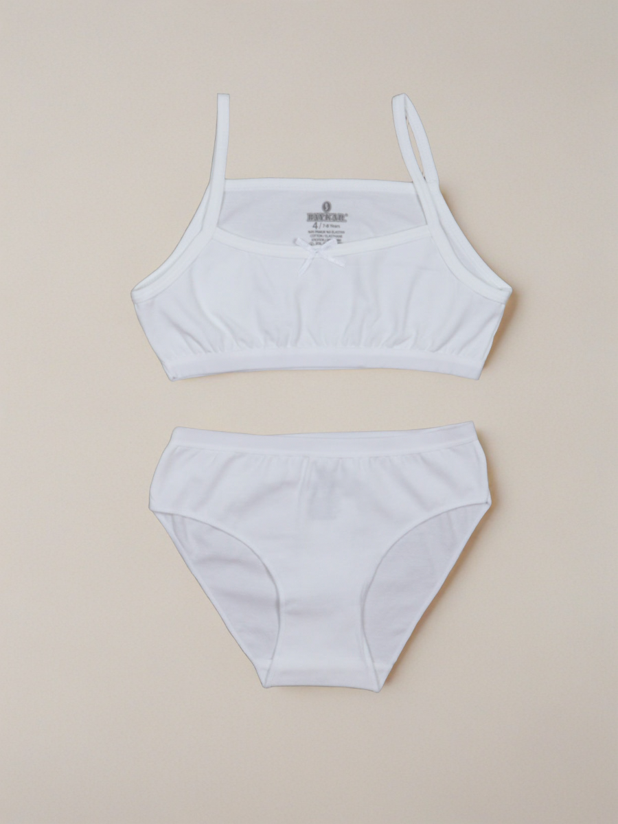Этот набор для юной леди от турецкой компании BAYKAR сочетает в себе долговечность, удобство в носке и актуальный внешний вид. Базовые вещи изготовлены из высокосортного хлопкового трикотажа, дополненного эластичными волокнами, что обеспечивает их устойчивость к деформации и потере цвета даже после многократных стирок. Продукция представлена двумя элементами — верхом (топом) и нижней частью (трусиками), оба выполнены в чистом белом оттенке.