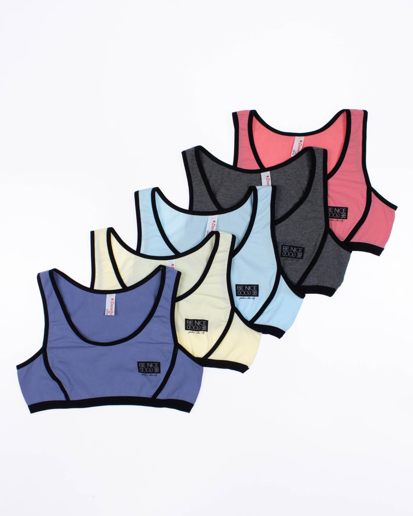 В упаковке рандомный цвет (без выбора цвета). Хлопковый Топ-бюстье Donella для девочки оптом. Низ изделия обработан мягкой бельевой резинкой, которая не передавливает тело, обеспечивая комфортную носку.